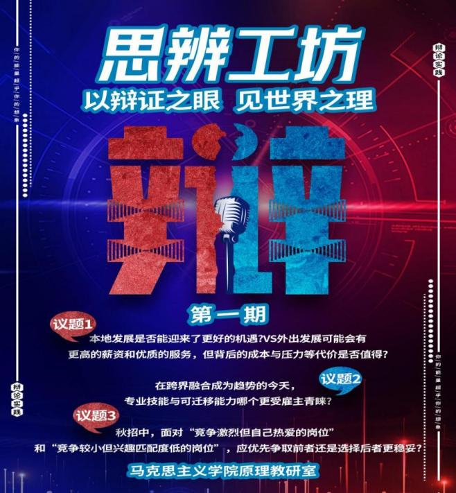 “思辨工坊”的核心亮点聚焦于辩题的精准设计,始终围绕“契合社会热点、聚焦学生需求”两大维度展开。原理教研室全体教师在前期调研中,充分结合当下社会发展趋势与学生成长痛点,既选取“本地发展是否能迎来更好机遇?外出发展高薪资背后的成本与压力是否值得”“跨界融合趋势下,专业技能与可迁移能力哪个更受雇主青睐”等贴合时代脉搏的社会议题,引导学生以辩证视角剖析复杂现实;又紧扣学生求职、发展的日常关切,将第一期辩题锁定“秋招中,‘竞争激烈但热爱的岗位’与‘竞争较小但兴趣匹配度低的岗位’,优先争取还是稳妥选择”等大学生高频关注的就业困惑,让思辨讨论从宏观的社会议题,精准落地到个人职业选择的具体场景,切实唤起学生的共鸣与表达欲。